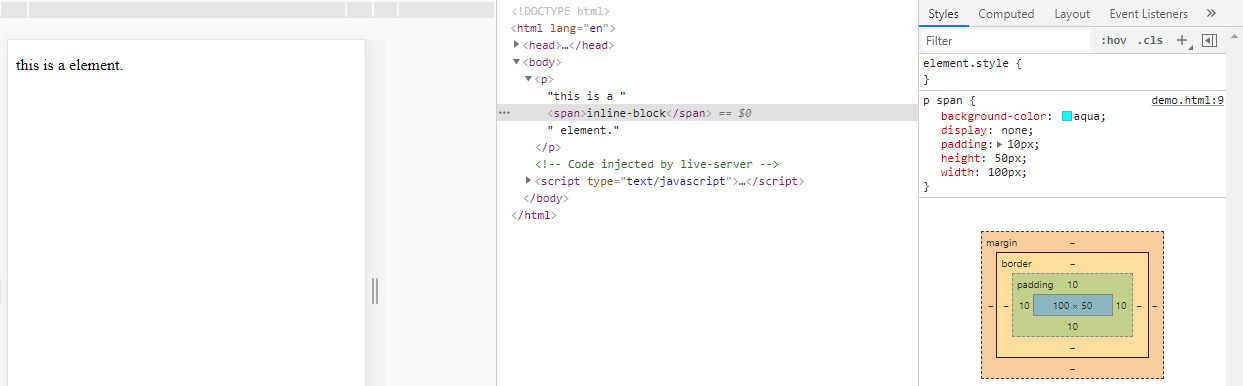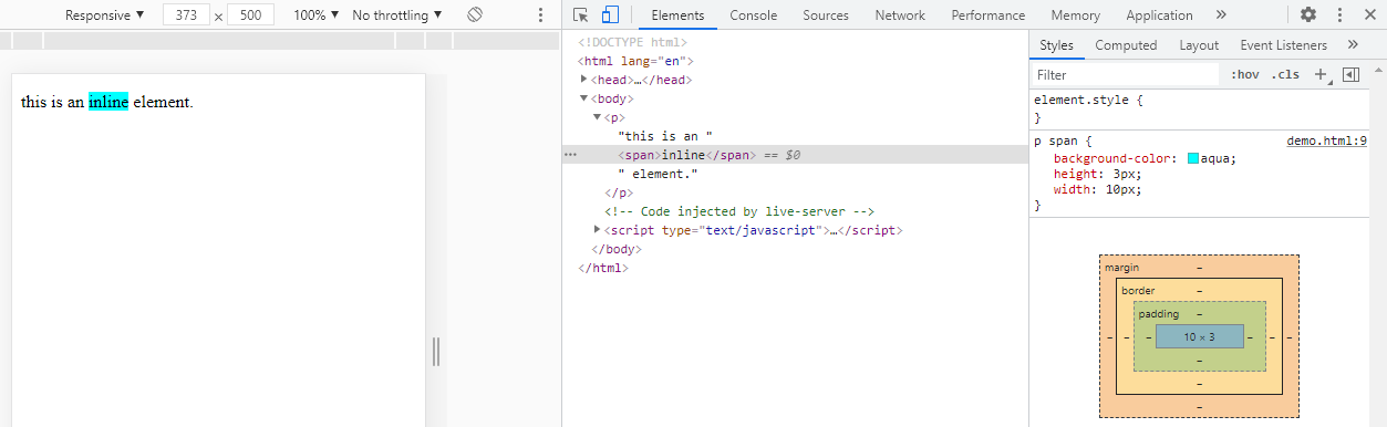 The image below shows an inline element "span".And since it's a inline element,it won't have any effect of height and width property on it.