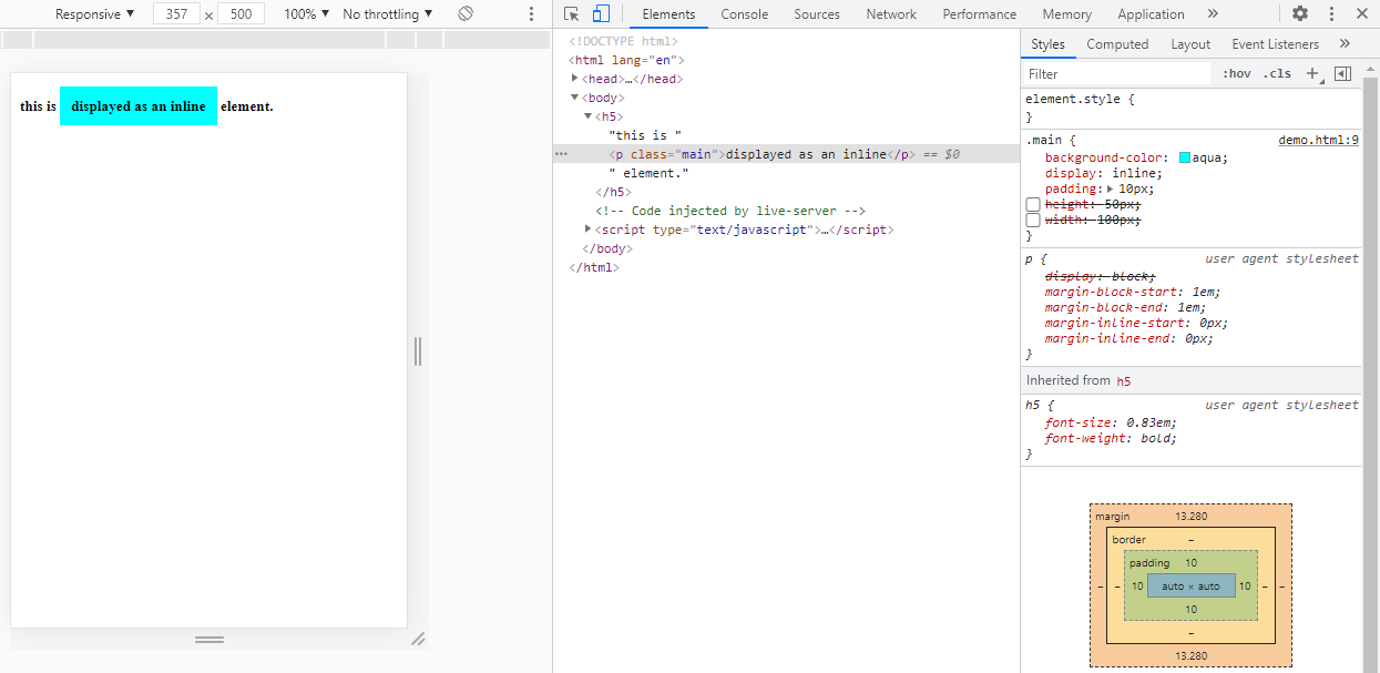 The image below is to show you that after removing th height and width property from the above example, the layout remains same.Hence,it's a proof that height and width property shows no effect on an inline element.