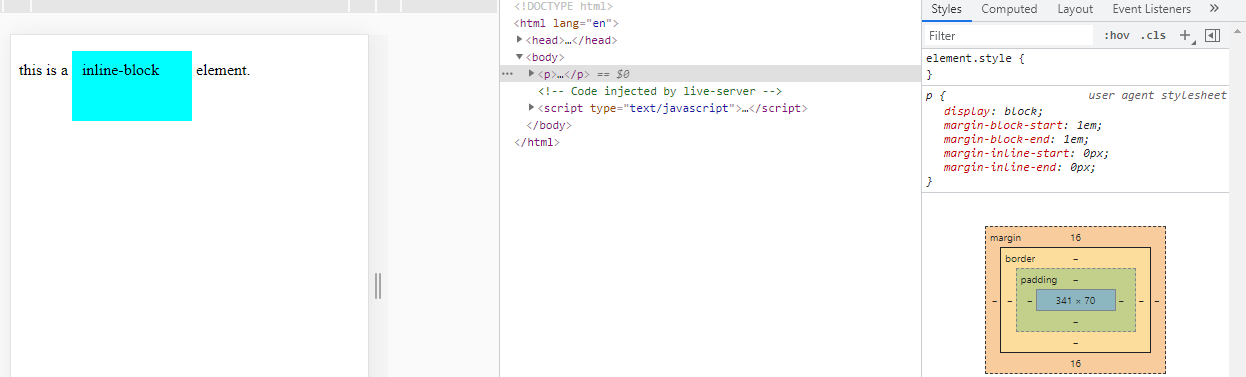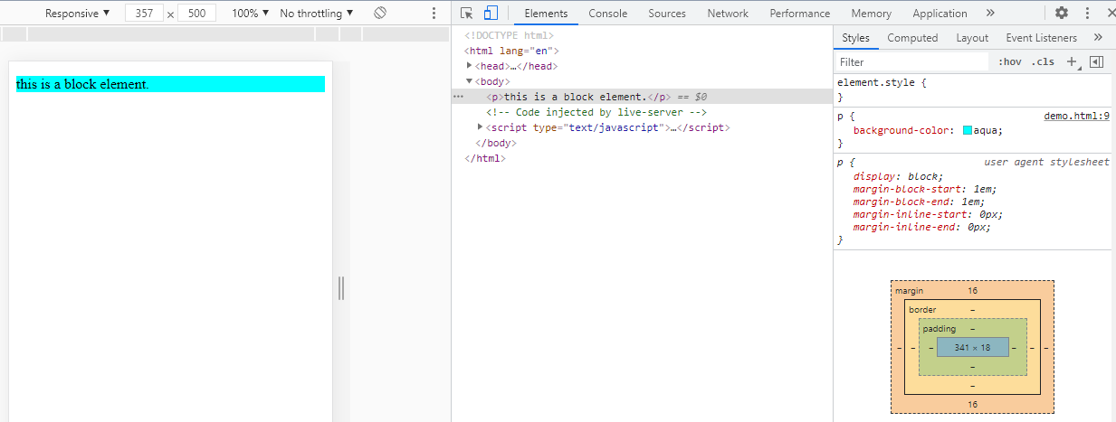 The image below shows a block element "p".And since it's a block element, it takes up to the whole width.